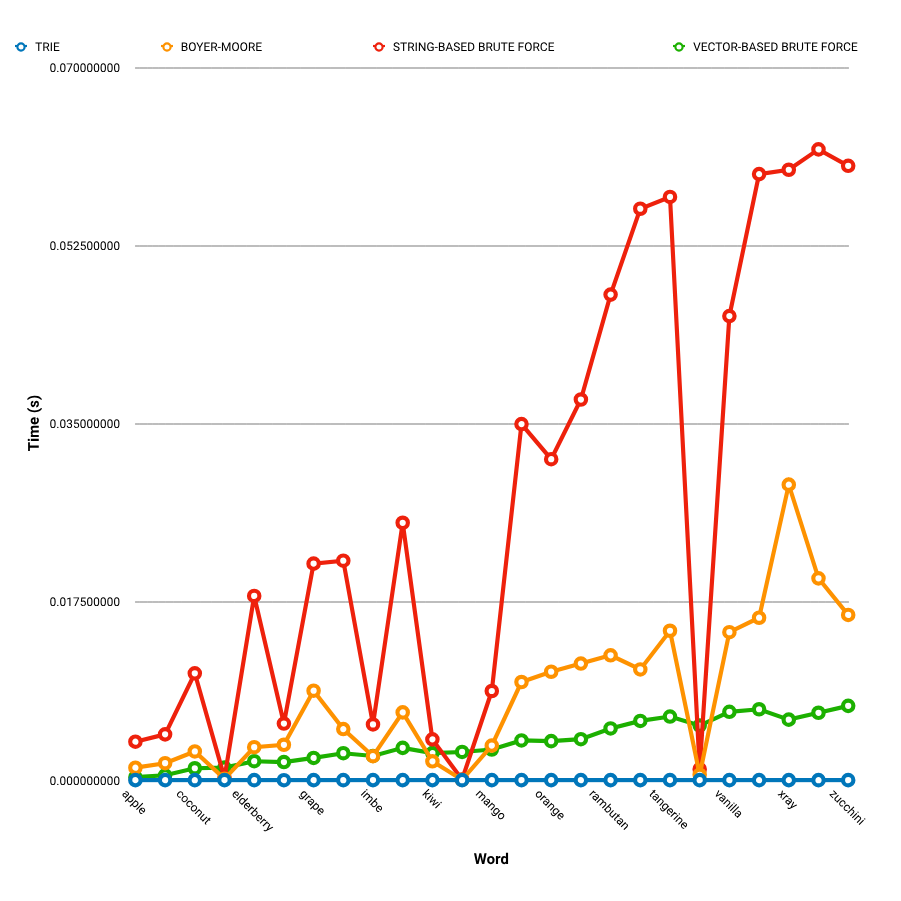 Runtime comparison of Boyer-Moore, standard trie, and two brute force searches on a 355K English words dataset.
